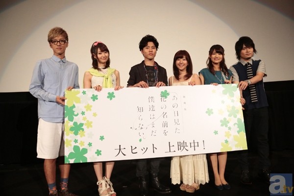 劇場版『あの日見た花の名前を僕達はまだ知らない。』(通称:あの花)が、本日8月31日(土)より全国公開!主要キャスト6名、入野自由さん、茅野愛衣さん、戸松遥さん、櫻井孝宏さん、早見沙織さん、近藤孝行さん登壇による初日舞台挨拶が行われた。