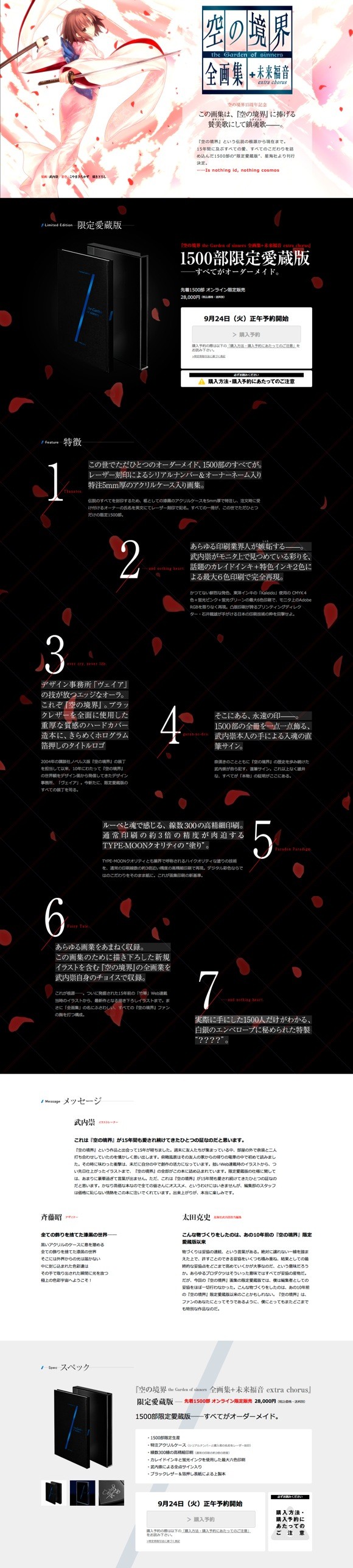 ![]() | 空の境界 the Garden of sinners 全画集+未来福音 extra chorus 限定愛蔵版 予約:2013年9月24日(火)正午より 発送:2014年1月中旬より順次発送予定 定価:28000円(税込み・送料別) 発行・発売:星海社 判型:アクリルケース装 A4判 1500部限定愛蔵版 全オーダーメイド 特注アクリルケース(シリアルナンバーと購入者の名前をレーザー刻印) 線数300線の高精細印刷(通常の印刷の約3倍の密度) カレイドインキと蛍光インクを使用した最大六色印刷 武内崇による全点サイン入り ブラックレザー&箔押し表紙による上製本 >>注文はコチラから |