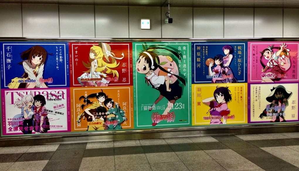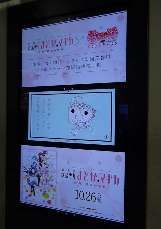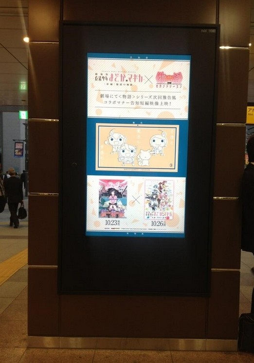 TVアニメ『<物語>シリーズセカンドシーズン』と『劇場版 魔法少女まどか☆マギカ[新編]叛逆の物語』のコラボレーション広告が秋葉原駅と新宿駅のデジタルサイネージ「J・ADビジョン」にて表示されている。