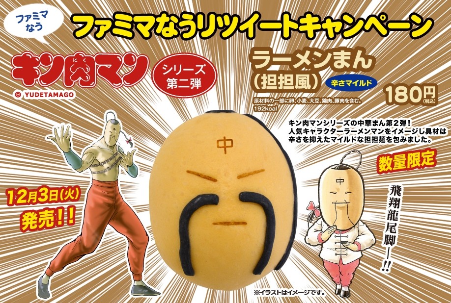 前回の「ウォーズまん」に続き、「キン肉マン」とのコラボ中華まんシリーズ第2弾となる「ラーメンまん」が全国のファミマにて12月3日から販売される。価格は180円。