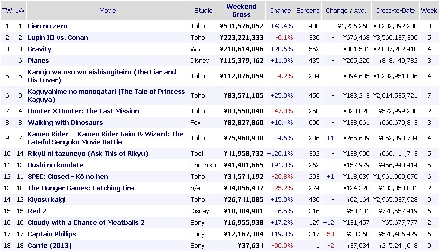 制作費50億円、スタジオジブリ作品『かぐや姫の物語』が、公開7週目にして累計動員165万6,551人、累計興収は19億8,291万9,150円と20億近い数字を記録している。先日興行収入20億円を突破した『劇場版 魔法少女まどかマギカ[新編]叛逆の物語』よりペースも早く、安定した勢いをみせている。1月6日、興行通信社発表の週末観客動員ランキングによると、『ルパン三世vs名探偵コナン THE MOVIE』は公開5週目にして依然2位。興収35億円を突破する絶好調ぶり!