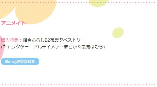 ANIPLEX+での“描き下ろし絵柄 【前後編&新編】収納BOX(デザイン:BALCOLONY.)”や“劇団イヌカレー描き下ろし特製A4クリアファイル”をはじめ、アニメイトのアルティメットまどかとデビルほむらが描かれている描きおろしB2布製タペストリーはとても魅力的だ。他の店舗もBSポスター、懐中時計など気になる特典ばかり。