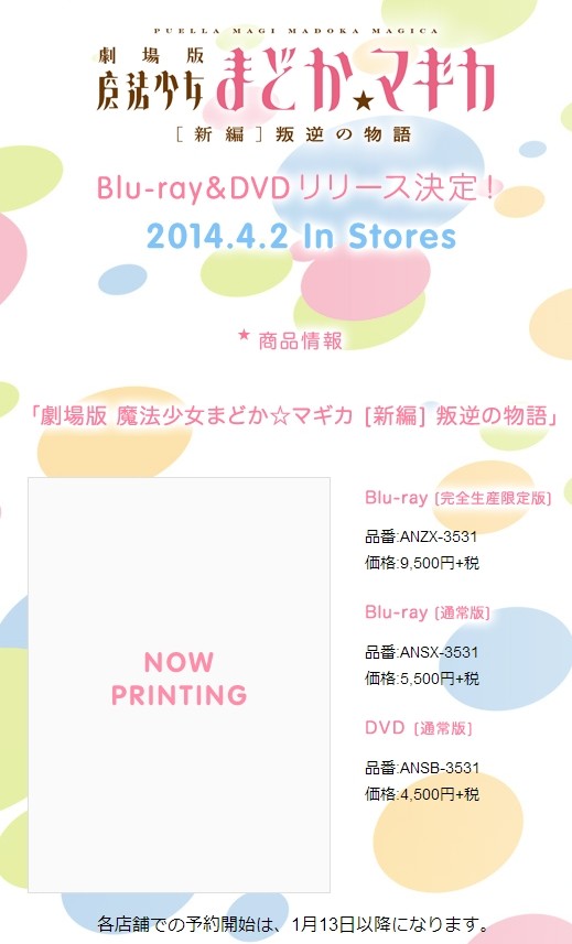 昨年10月公開され、興行収入20億を突破し現在も公開中の『劇場版 魔法少女まどか☆マギカ [新編] 叛逆の物語』(まどマギ新編)。そのBlu-rayとDVDが2014年4月2日に発売されることが決定し、店舗別の購入特典も公開された。