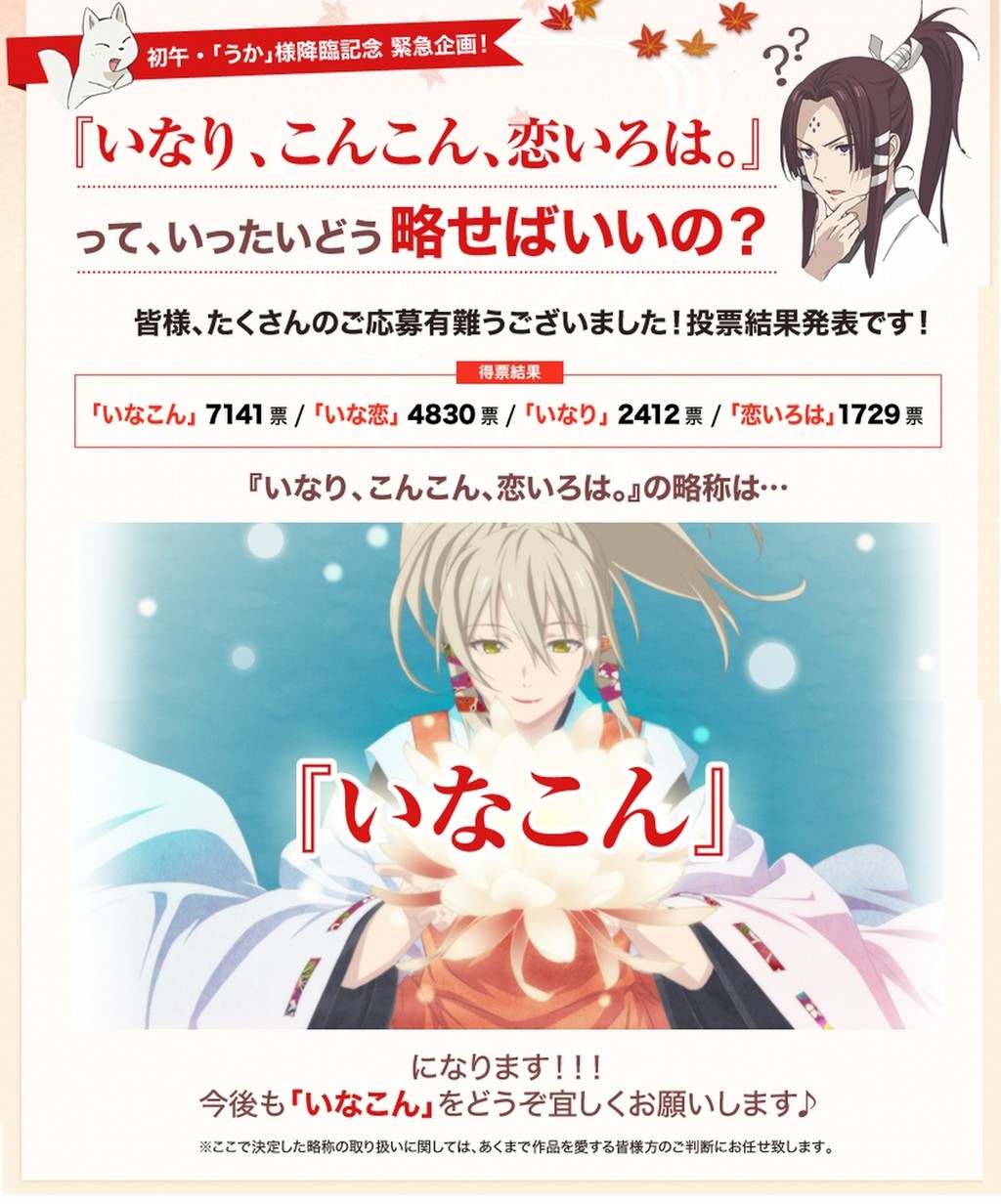 先日公式サイトにて行われたTVアニメ「いなり、こんこん、恋いろは。」の略称を決める投票企画の結果が発表された。