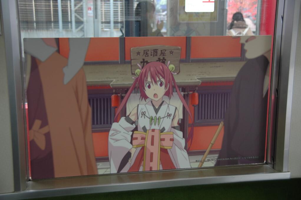 これは「いなり、こんこん、恋いろは。」「有頂天家族」「京騒戯画」「劇場版 薄桜鬼」など京都が舞台の4作品のキャラクターを用いてデコレーションされたアニメ列車で、「京都国際マンガ・アニメフェア」の取組をPRする目的で実施されているもの。