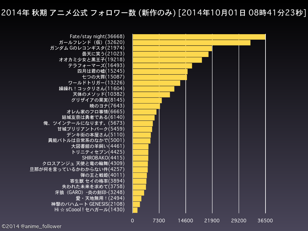 anime_follower@anime_follower秋期(新作のみ)のアニメ公式フォロワー数ランキングは 3位=ガンダム Gのレコンギスタ(21974) 4位=曇天に笑う(21023) です。#gレコ #donten http://t.co/i7vtNzCmUi