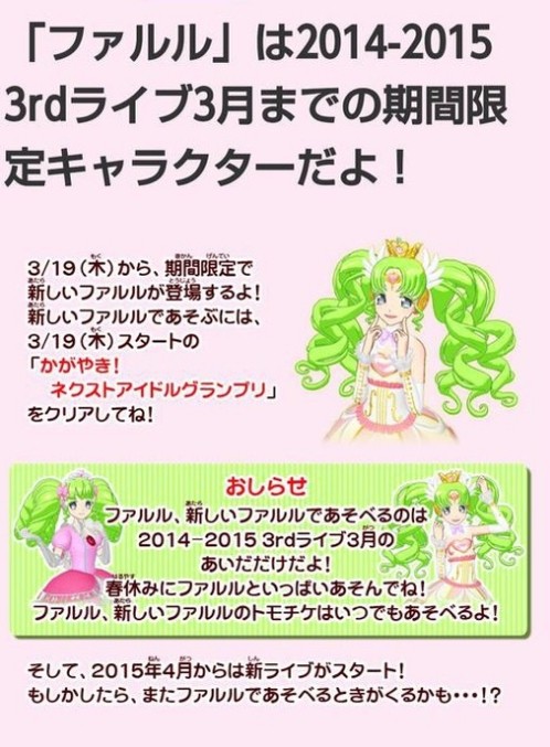 春からはファルルどうなるんだろ、公式ビジュにはいなかった気がするけど、一応仲間のアイドルとして出てくるのかな?