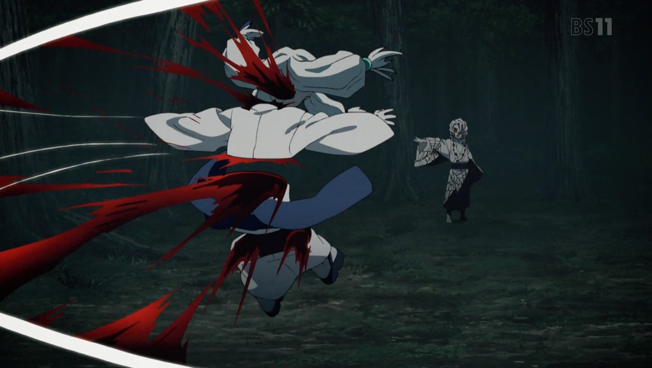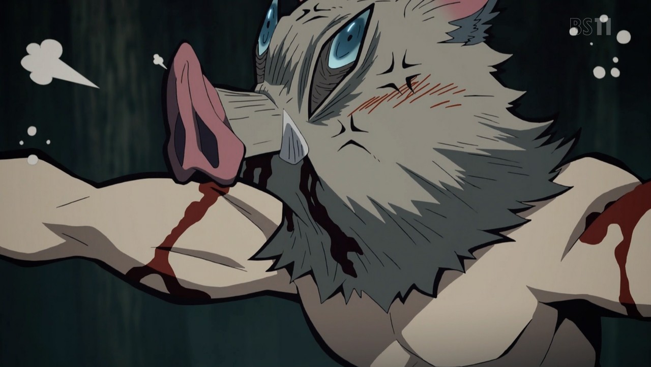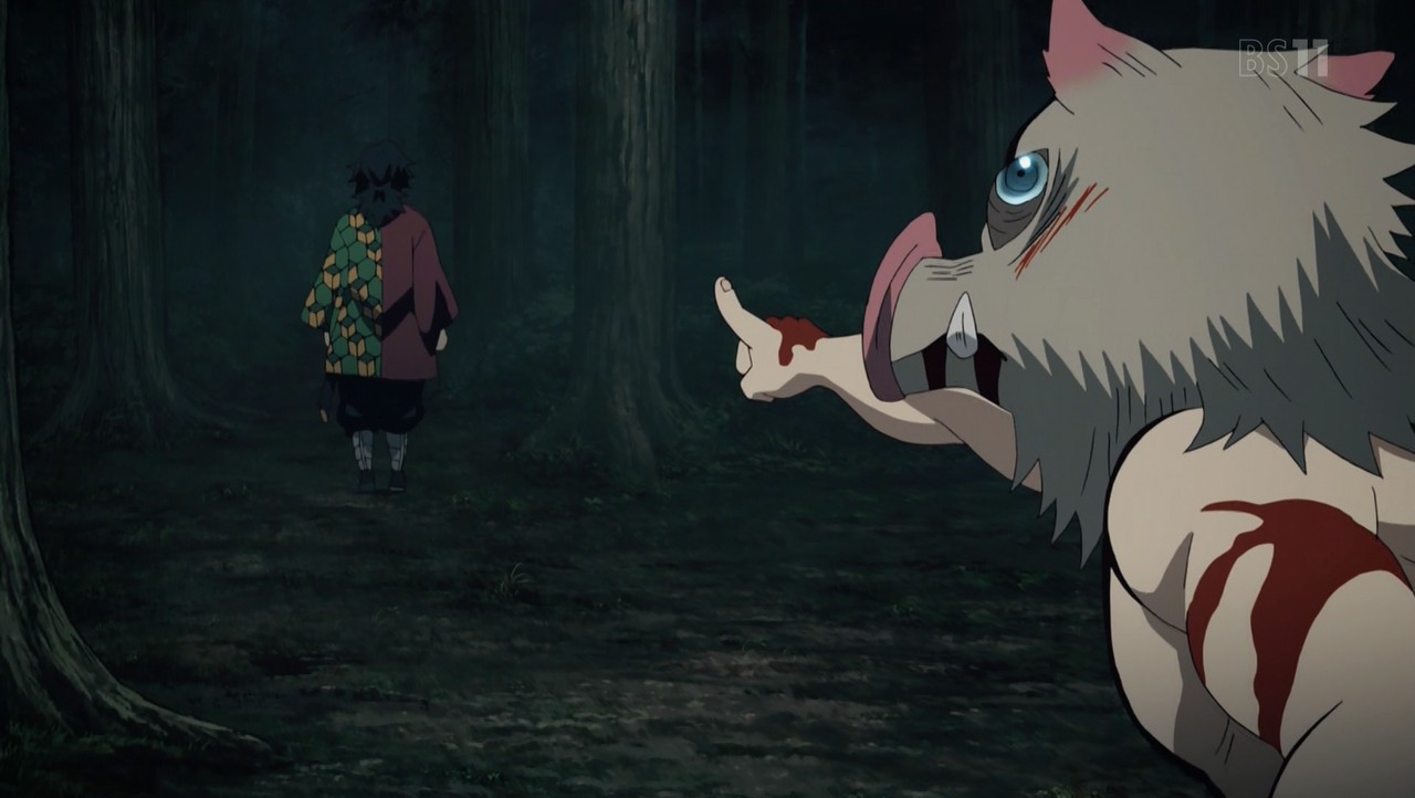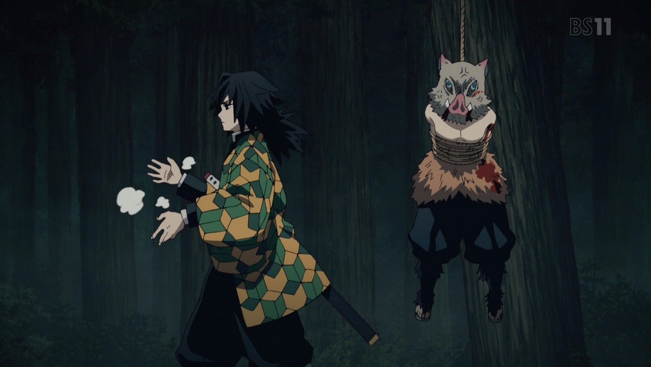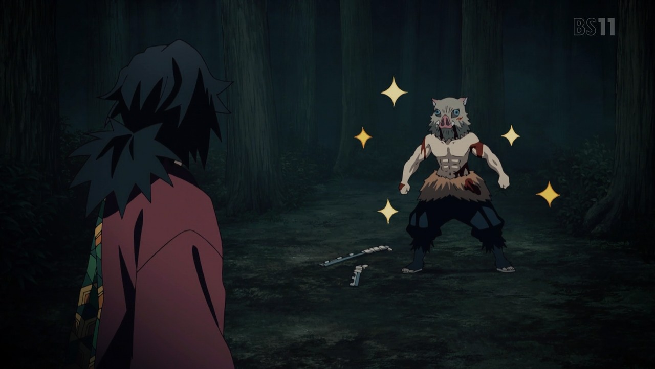 父鬼を一太刀で切り伏せる水柱・冨岡義勇。 その太刀筋を見た伊之助は己との格の違いに興奮し、戦いを申し込む。