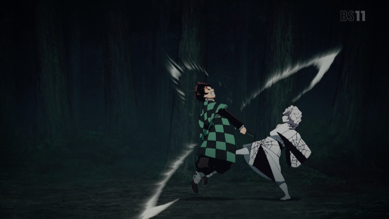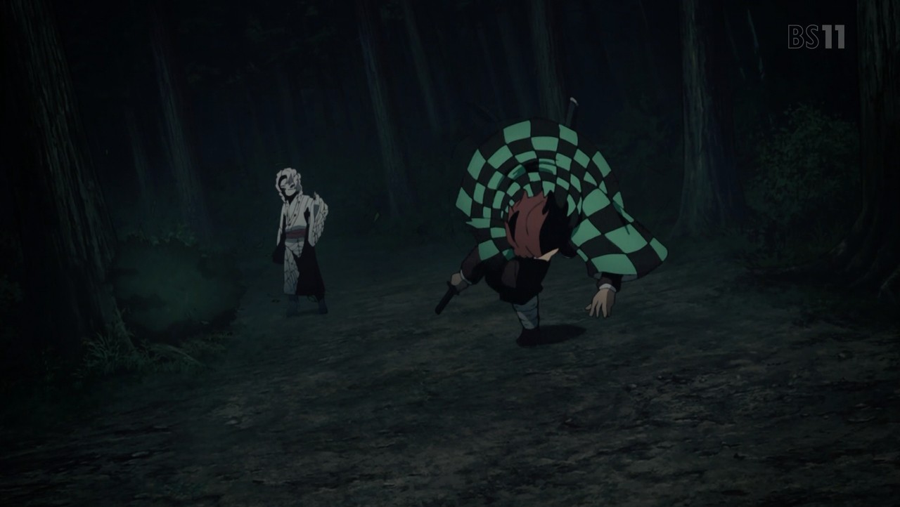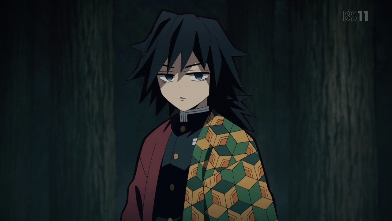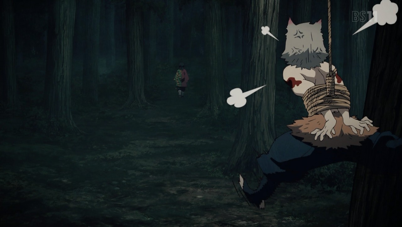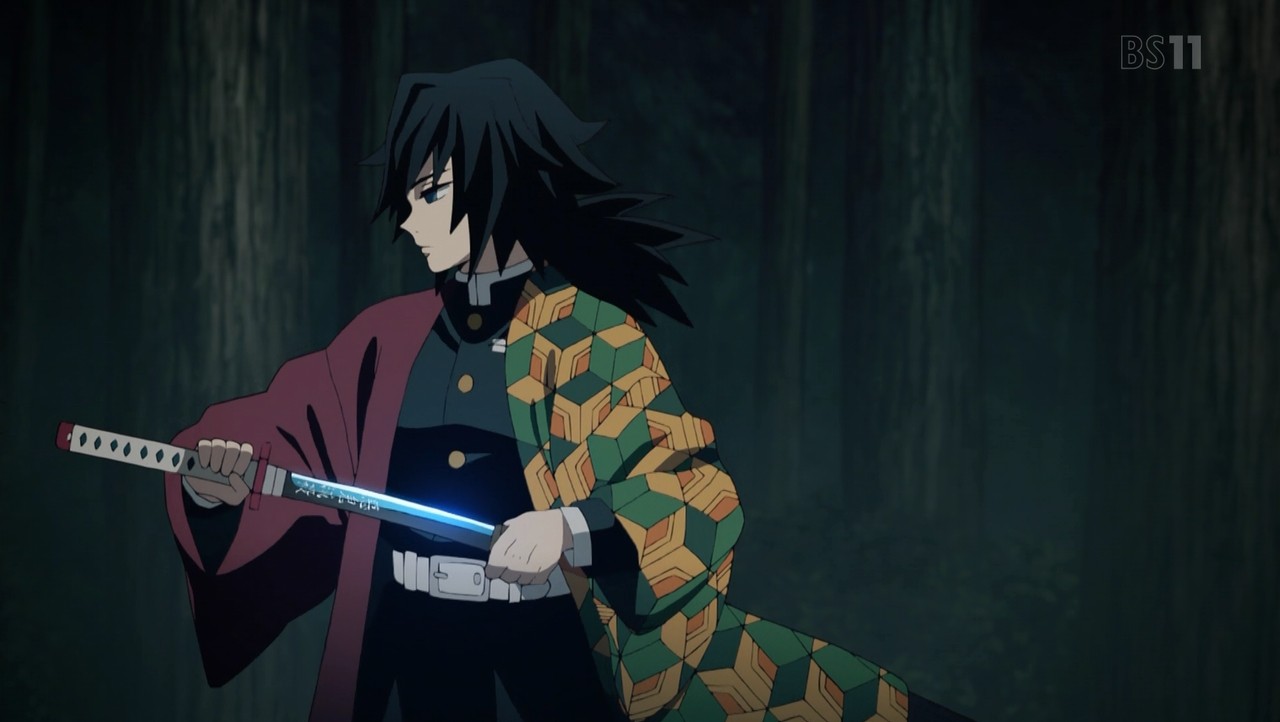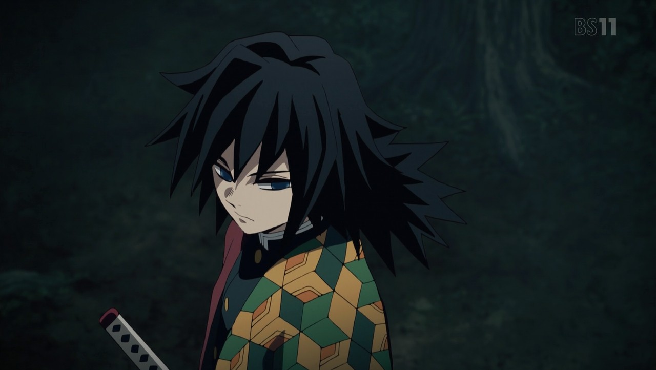父鬼を一太刀で切り伏せる水柱・冨岡義勇。 その太刀筋を見た伊之助は己との格の違いに興奮し、戦いを申し込む。