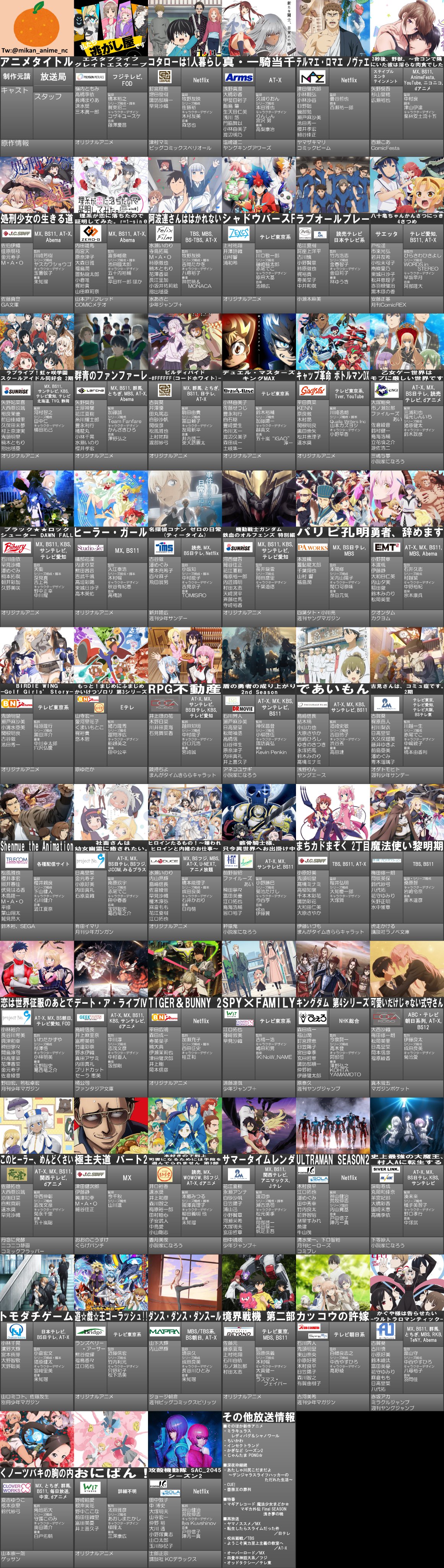 日:八十亀ちゃんかんさつにっき(BS11)、ブラックロックシューターDAWNFALL(KBS)、このヒーラー、めんどくさい(BS11)