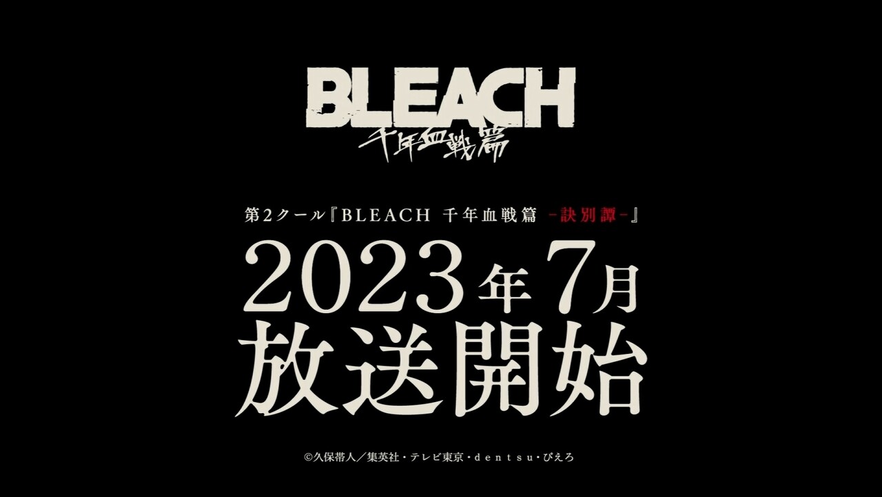 第2クール『BLEACH 千年血戦篇-訣別譚-』は、2023年7月より放送予定です!1クール目同様、アニメで追加されるバトルやシーンもあるかも…?!楽しみにお待ちください!<スタッフ>