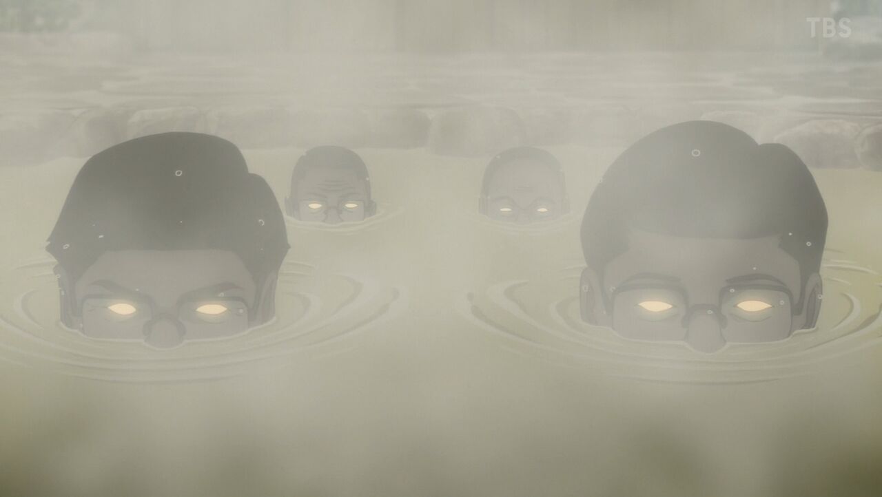 ワニのおっさんたちの顔つき・体型・顔色全てが気持ち悪いんだが全員でバシャアと決めポーズのようにかけ湯するとこだけちょっとワロタ