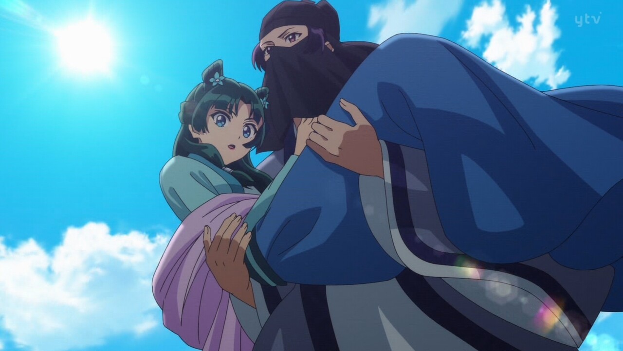 一期最後で猫猫を抱えながら城壁の上から飛び降りた壬氏様だ