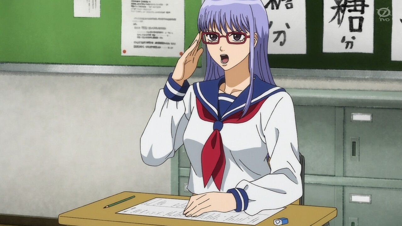 銀八の作った現代国語のテストを受けた新八は、その滅茶苦茶な問題にツッコミが止まらない。