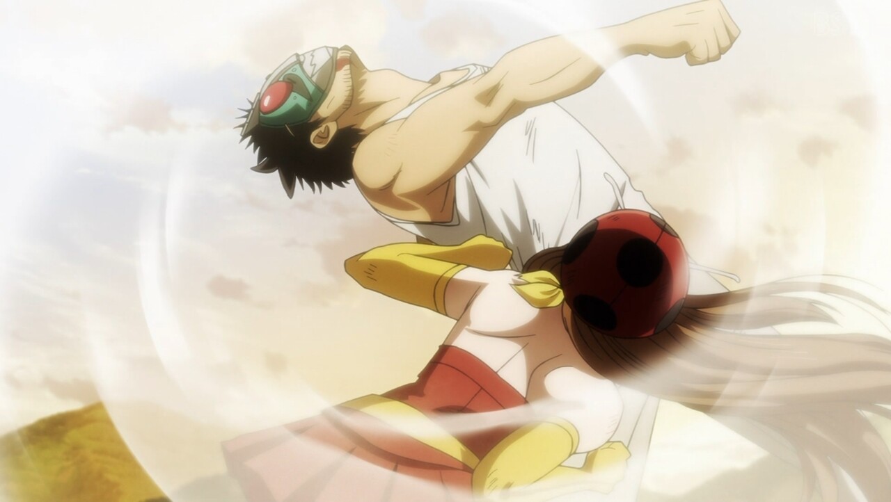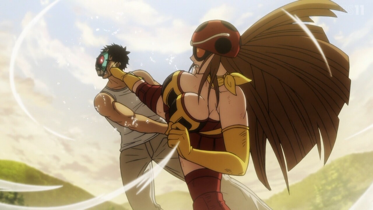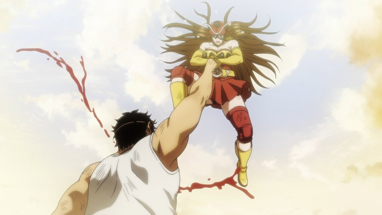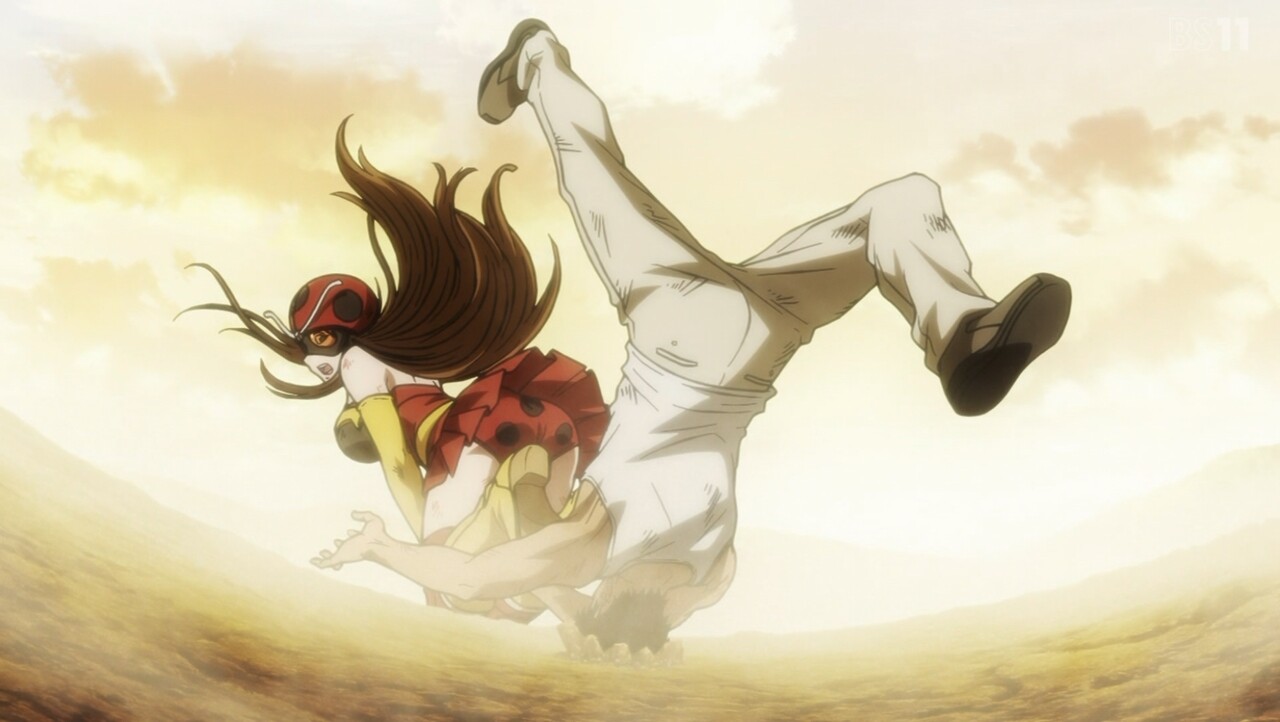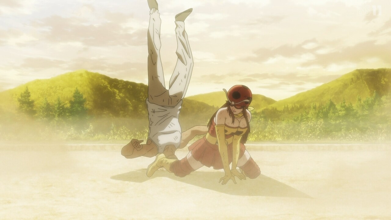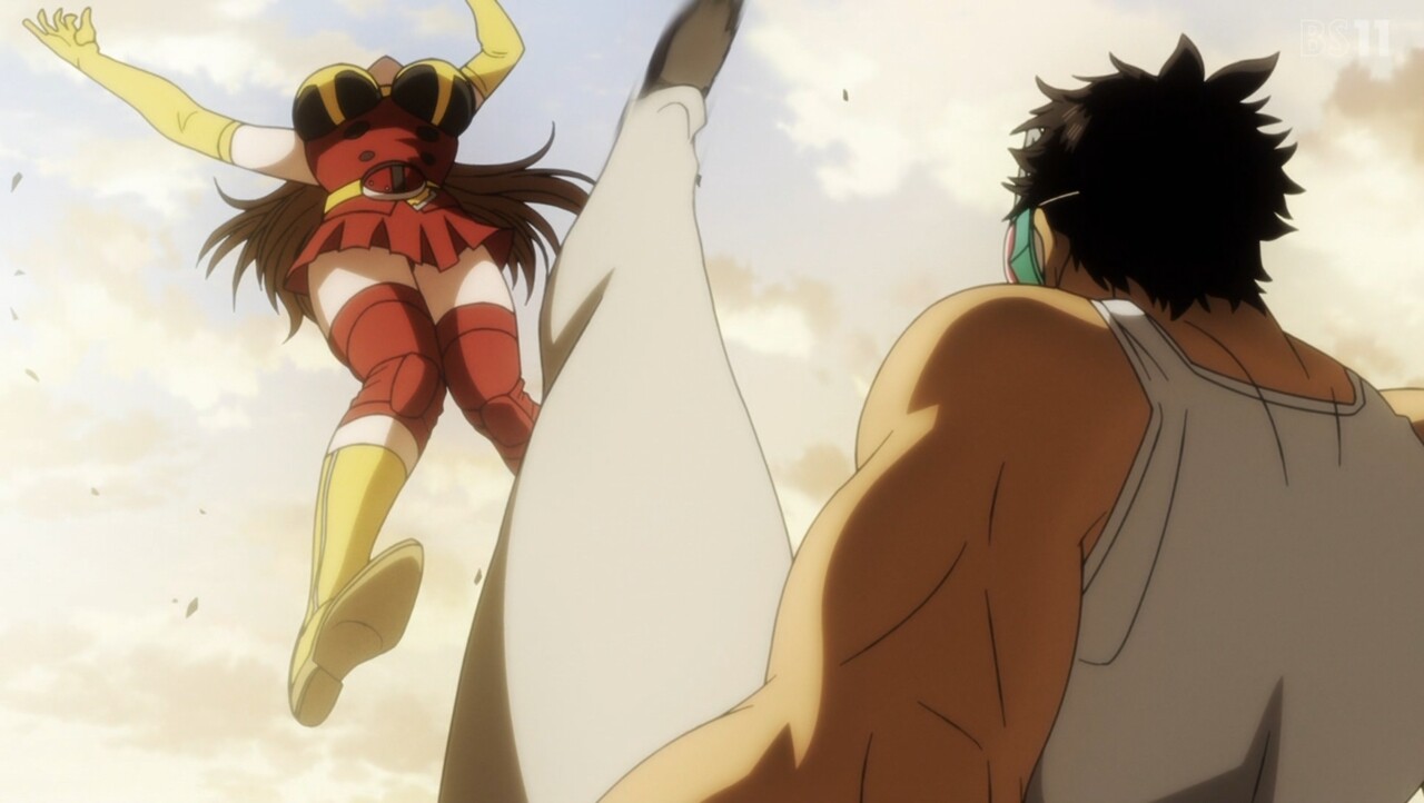 トーナメント3戦目は東島vs.ユリコ。 蜘蛛男ですら尻餅をつかせた東島のライダーパンチに、思わず身震いするユリコ。 しかし、タックルとしてのプライドから己を奮い立たせて対抗する。 激戦を繰り広げ最大火力でぶつかる二人に、ユカリスは仮面ライダーと電波人間タックルの姿を見る……